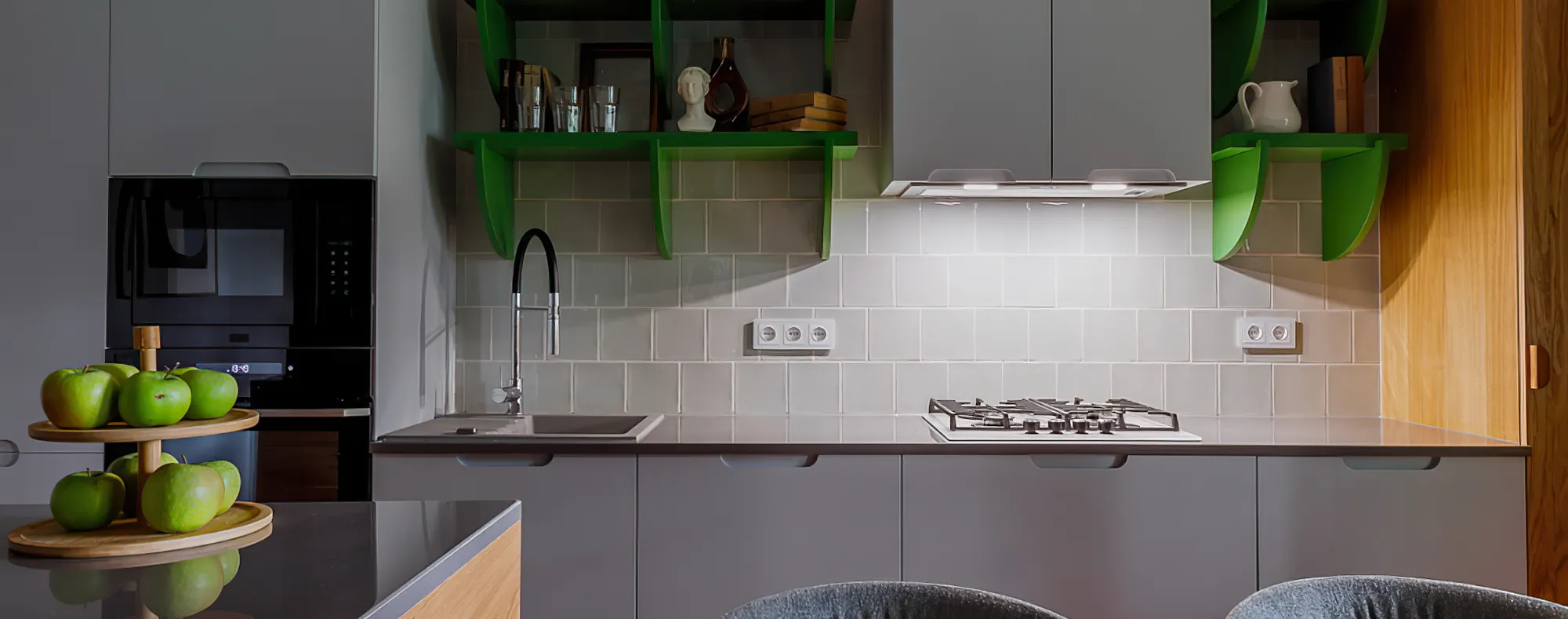 Проект сосредоточился на преображении входной зоны и кухни-столовой. Входная зона наполнилась теплом и гостеприимством благодаря светло-зеленой цветовой гамме, современной мебели и ярким акцентам. Кухня-столовая приобрела больше свободного пространства за счет грамотного зонирования и функциональной мебели. А настоящей изюминкой интерьера стал легкий блеск, который добавили электроустановочные изделия Werkel™ .