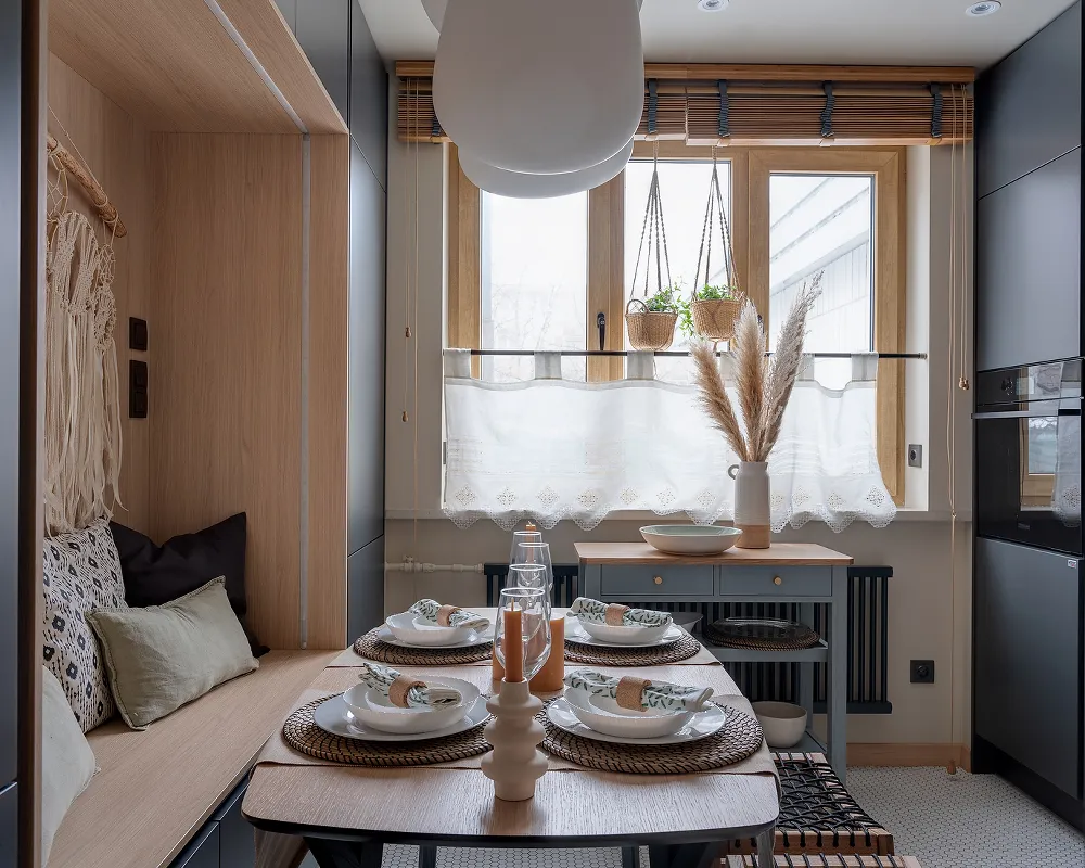 Тёплые сливочные тона кухни разбавили тёмными фасадами цвета сажи, добавив интерьеру глубины и контраста. Идеально ровный потолок украсили встроенные споты 9914 LED, которые стали основным источником верхнего света. Эти светильники создают эффект «света из ниоткуда», благодаря чему кухня выглядит современно и стильно .