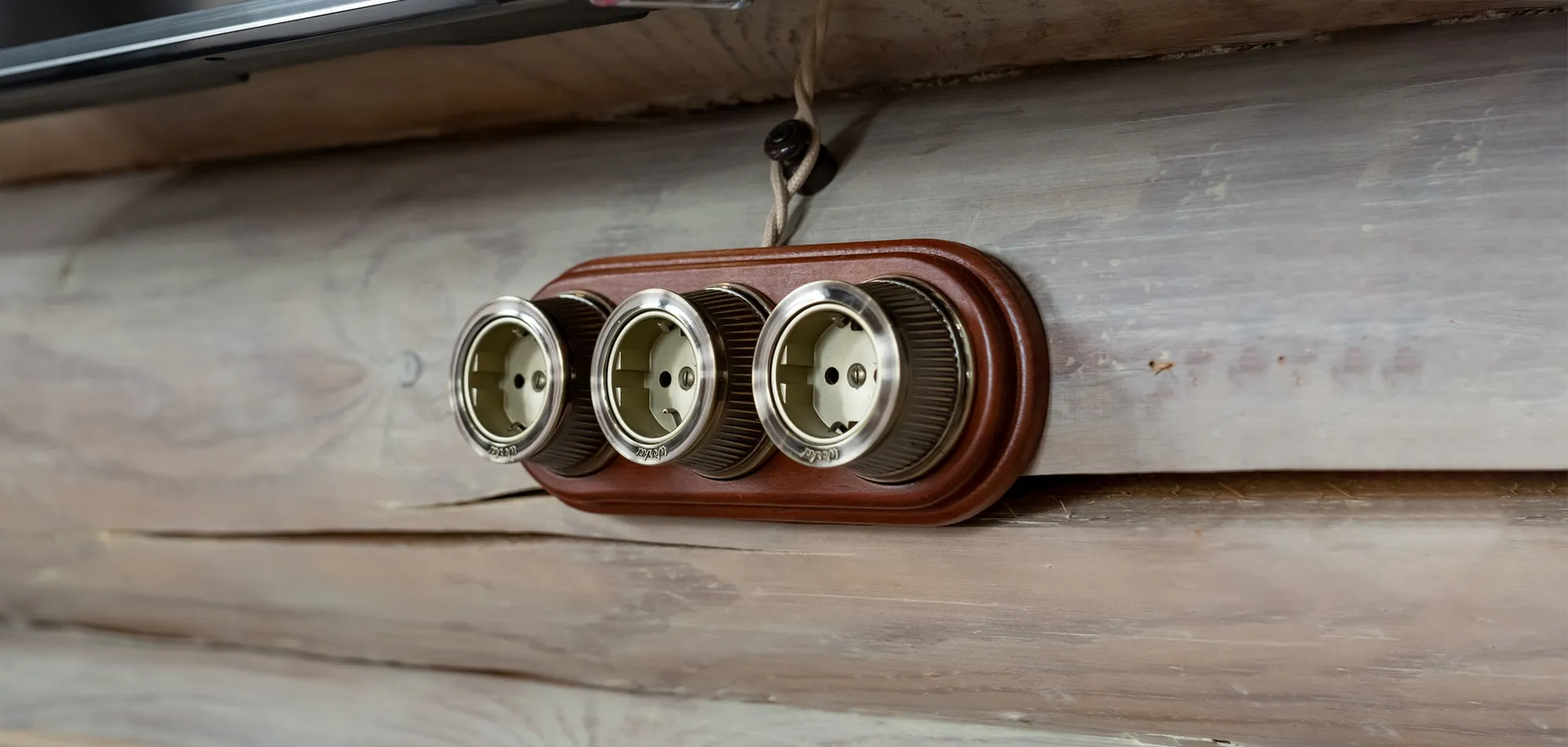 Одним из ключевых элементов интерьера стали электроустановочные изделия Werkel™, выполненные в ретро-стиле. Деревянные рамки плавной формы гармонично дополняют общую концепцию гостиной. Все механизмы имеют прочный керамический корпус, а поворотные выключатели оснащены характерными сменными ручками-барашками. Для разводки использовали ретропровод, закрепленный на стене с помощью керамических изоляторов, что добавило интерьеру аутентичности и шарма.